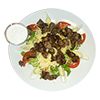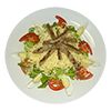 friss salátaágyban paradicsom, uborka, tojás, sajt, öntet és csirkemell csíkok